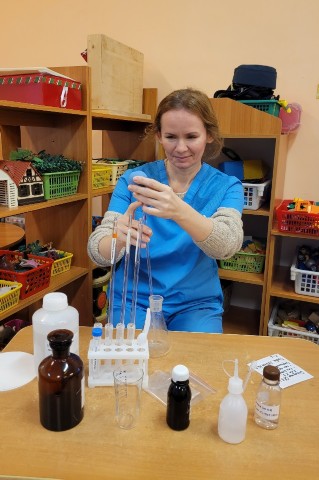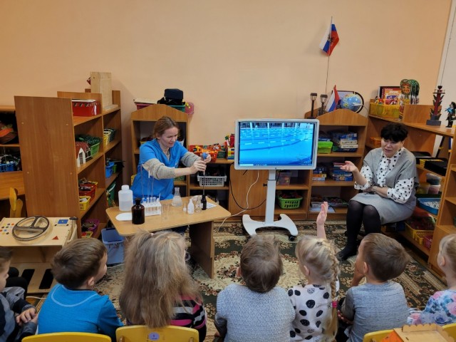 Кто такие химики? Об этом увлекательно рассказала детям группы «Солнышко» мама Титовского Матвея, Светлана Викторовна. Она познакомила ребят со своей профессией химик-лаборант.
